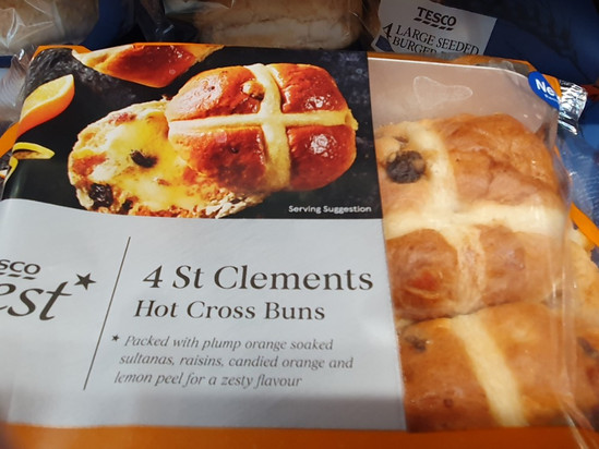 7. Немного о кулинарии. Среди традиционных английских блюд много разных пирогов и пудингов, в основном круглых, и булочек. Например, на Рождество пекли специальные маленькие круглые пироги Mince pie, а к Пасхе (а подготовка к ней началась сразу после Рождества) пекут вот такие (свежее фото из магазина, до Пасхи 2 месяца).
